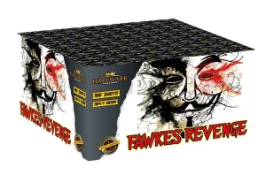 Fawkes Revenge – 100 x 25mm shots by Hallmark Fireworks is a multi angled, multi effect barrage that will stand out in any firework display. Starting with vertical golden brocades and strobes with a splash of colour followed by a fan of brocades and crackles to V firing crackling comets with coloured stars in-between and ending in a flurry of shots fired in pairs giving it that awesome firing sequence topped with loud reports.