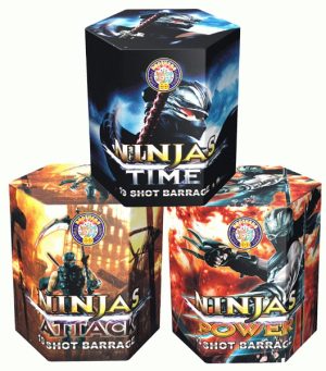 Three different 19 shot, Cat 2 Ninja cakes all with different effects. This is ‘Ninjas Power’ 19 alternating shots of red and yellow stars to crackling. Please note this for 1 piece and may vary depending on stock.
